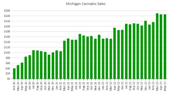 Michigan cannabis sales fell 0.1% in May from the shorter April to $245.9 million. On a per-day basis, sales slipped 3.3%. The growth of 31.9% from a year ago was up a little from the 26.2% level last month: