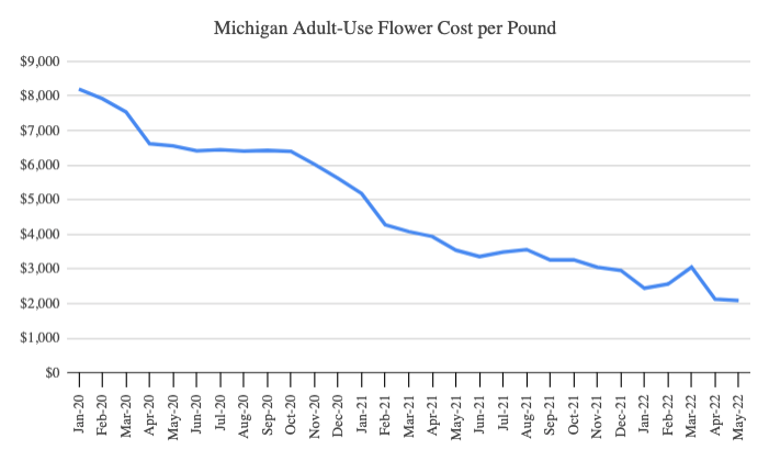 As supply continues to expand, flower pricing for adult-use continues to decline. In May, the average price of $2,090 fell 1.8% sequentially and 41% from a year ago:
