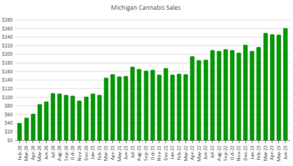 Michigan cannabis sales rose 6.0% in June from the longer May to a record $260.8 million. On a per-day basis, sales grew 8.8%. The growth of 39.2% from a year ago was up from the 31.9% level last month: