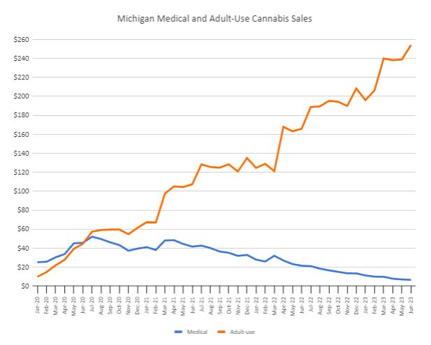 The Michigan Cannabis Regulatory Agency breaks out sales by medical and adult-use, with medical sales falling 69.1% from a year ago to $6.6 million, down 5.8% sequentially, and adult-use sales expanding 53.2% year-over-year to $254.2 million, up 6.4% sequentially: