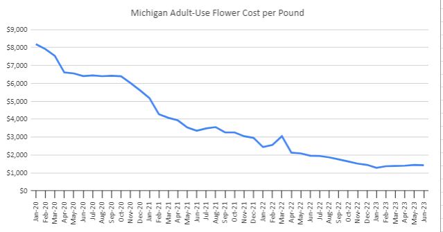 As supply continues to expand, flower pricing for adult-use has seen a dramatic decline. In May, the average price of $1428 per pound fell sequentially, losing 1.5% and falling 27.1% from a year ago: