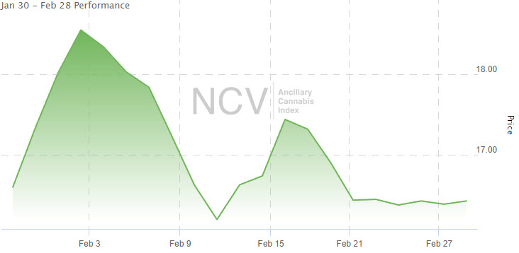 The American Cannabis Operator Index was one of the weakest parts of the market in January, but it was relatively strong in February when it was unchanged at 15.14. It is up 6.3% in 2023: