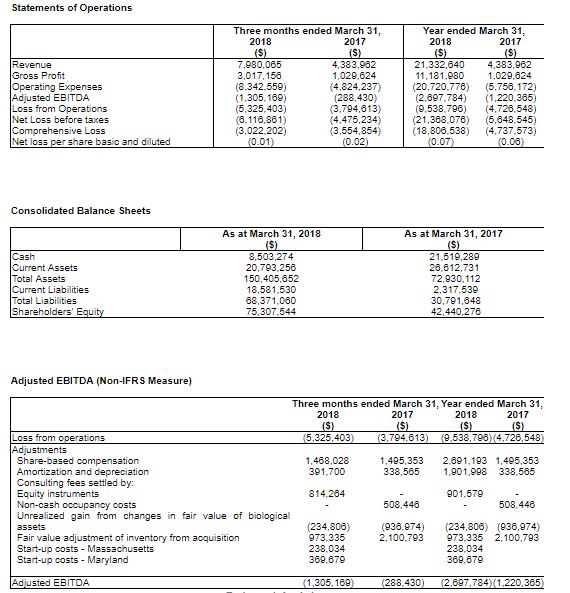 Mr. Boyes commented on the expenses, “Our expansion efforts drove the higher expenses seen in fiscal year 2018. These expenses include license applications, the hiring of construction managers to oversee the build-out of new dispensary, production and cultivation sites, and the hiring and training of new staff and supervisors in advance of site openings. Furthermore, we utilized consultants to find and secure real estate in target markets which face restrictive zoning rules, and lobbyists for advice and general government relations. We believe this investment in infrastructure and staffing will support our strategy to penetrate new markets, bring our brands to a wider patient base and grow our footprint.”