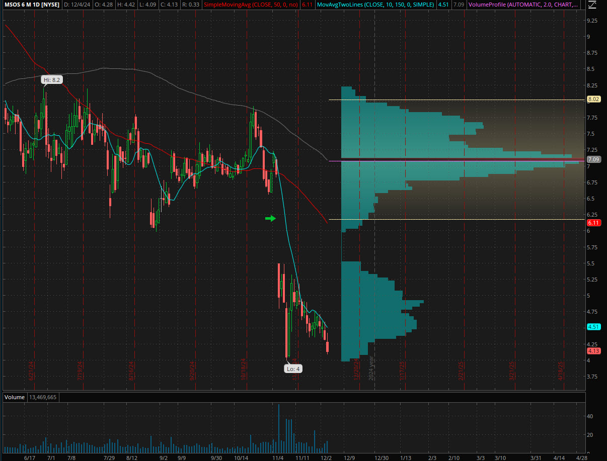 Last week, I pointed out that the overall market has not taken out its all-time low on the GCSI from October 2023, and it still has not. That $4 low MSOS set on 11/11 is key to watch in my view, as we could be forming a potential double-bottom for MSOS. The prior all-time low for MSOS was $4.78 in late August of 2023.