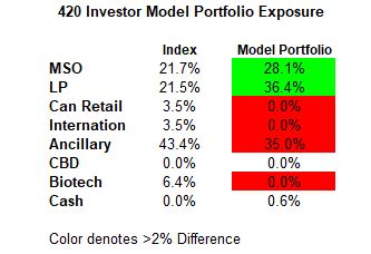 I have long shared my view here about the many ways cannabis investors can participate in the growth of the industry. Many investors choose to focus on and and invest in only MSOs, but there are opportunities outside of that sub-sector. My Beat the Global Cannabis Stock Index model portfolio is currently overweight the MSO sub-sector (4 holdings) and the Canadian LP sub-sector (3 holdings) but underweight Ancillary (4 holdings):