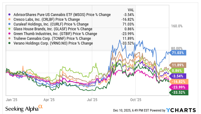 The ETF ended the week with a bit of leverage, as it was invested in cannabis stocks at 102.8% of its NAV, though sales were made this week. While Curaleaf did rally after my piece last week by 9.3% since then, MSOS actually fell 0.5% to $3.67. Looking at the 6 stocks that have an exposure of more than 5%, it is the only one up, with the rest declining by at least 2.8% to as much as 6.8%. These six stocks include the five largest ETFs and also Glass House Brands. Here is MSOS and its six current positions that account for 88.5% of the ETF in 2025 so far: