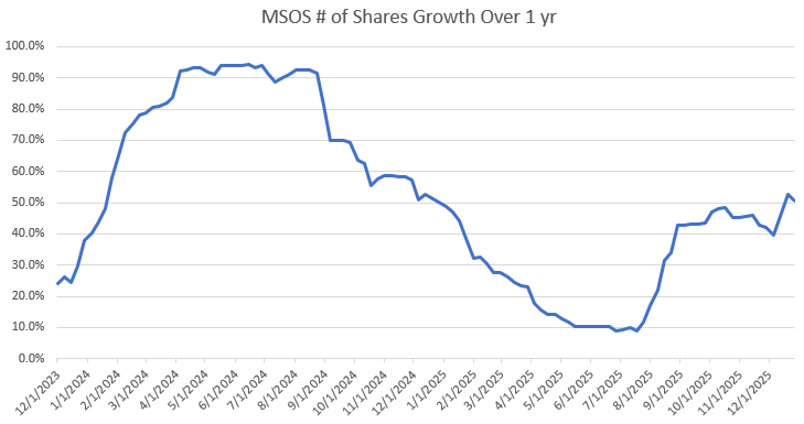 Currently at almost 40% growth over the last year, it is high growth that has already had a big impact on the price of MSOS. which at its peak in August was up 55% year-to-date. The world of cannabis investors has gotten much smaller, which leaves the entire sector, including MSOS and the MSOs as less liquid.