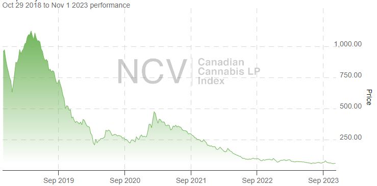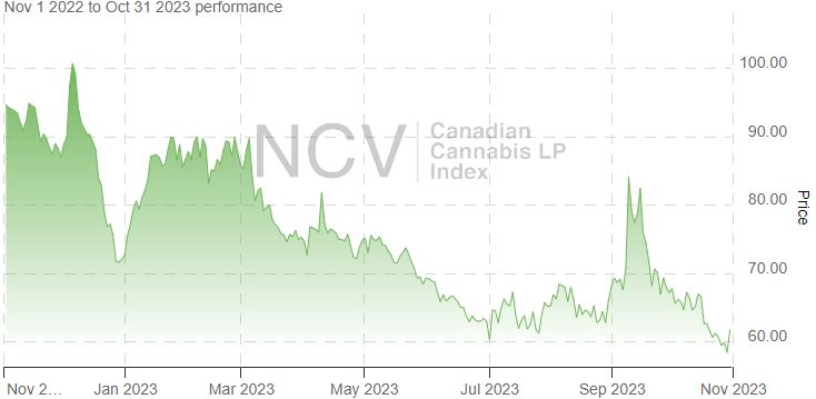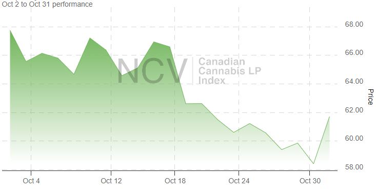 The Canadian Cannabis LP Index was very strong to begin the year, but it has been weak since then. In October, it dropped 8.1% to 61.70: