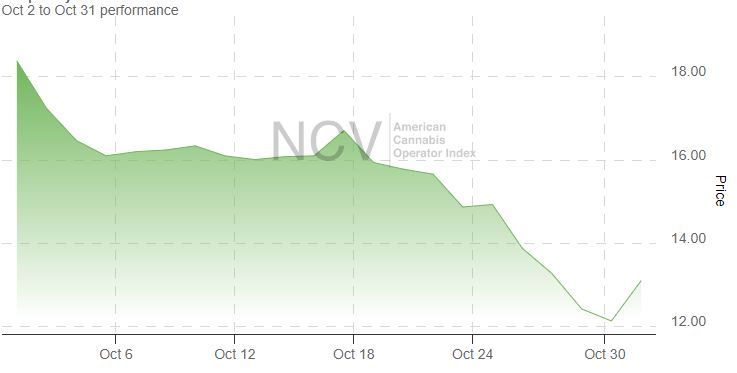 The American Cannabis Operator Index was crushed, losing 28.1% to 13.09: