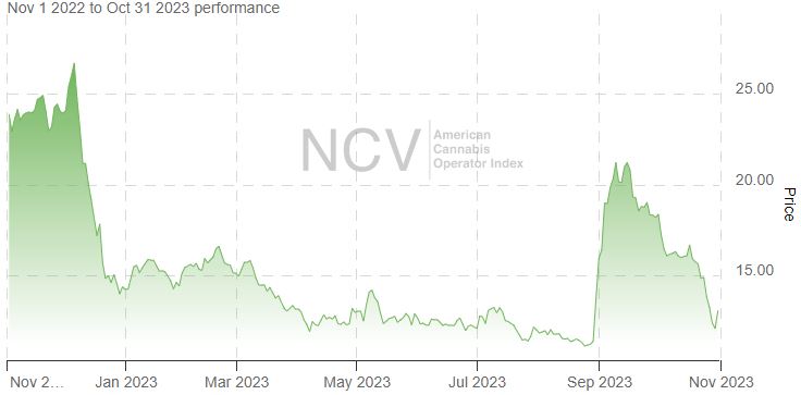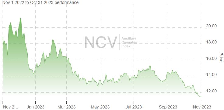 Down 8.6% in Q1, the index fell 6.9% in Q2. In Q3, it rallied 50.2% . After the big loss in October, it is down 8.1% in 2023, which is better than the Global Cannabis Stock Index. Over the past year, the index has declined 46.6%: