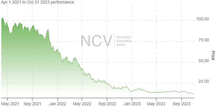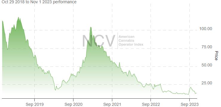As we described in a previous article, the Global Cannabis Stock Index plunged in October after three consecutive monthly gains. That index is now down 26.1% year-to-date, which has followed a record decline of 70.4% for 2022.