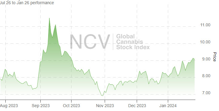After a bear market that started in early 2021, it sure feels like a bull market! The NCV Global Cannabis Stock Index has rallied 11.7% to start the year. It is up 22.1% since late August, when the news broke that the Department of Health & Human Services was recommending that the DEA move cannabis from Schedule 1 to Schedule 3: