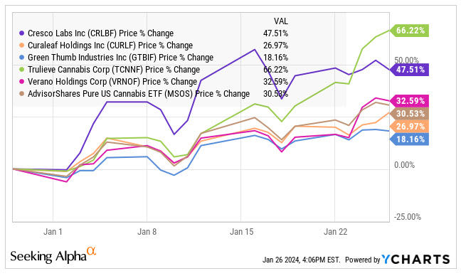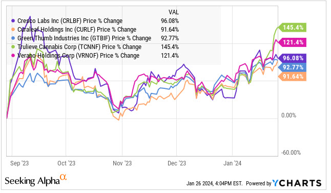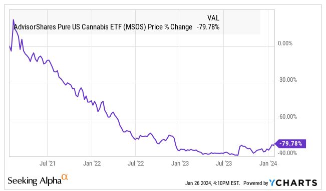 The largest MSOs have rallied too much, in our view. One thing that I watch is AdvisorShares Pure US Cannabis ETF (NYSE Arca: MSOS), and it is up by 30.1% to begin 2024 to 9.12 from 7.01 and is up by 88.7% since 8/29. Of course, it has dropped a lot over the past three years: