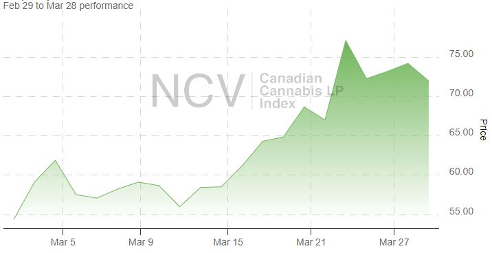 The Canadian LPs trade mainly below C$1, with just five of the stocks having a higher price at the end of March. 5 of the 12 stocks in the index closed below C$0.25. During March, Canopy Growth (TSX: WEED) (NASDAQ: CGC) led the way, rallying 162.6%. ilray Brands (TSX: TLRY) (NASDAQ: TLRY) experienced a 41.7% gain, while Aurora Cannabis (TSX: ACB) (NASDAQ: ACB) increased 38.9%. Cronos Group (TSX: CRON) (NASDAQ: CRON) gained 25.0%, but Organigram (TSX: OGI) (NASDAQ: OGI) increased only 4.0% after pricing an equity sale.