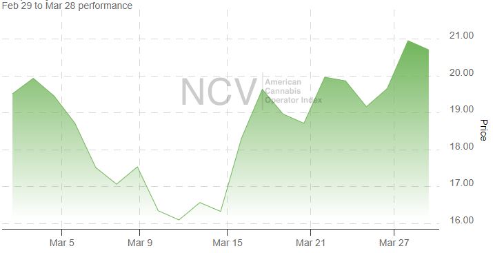 The American Cannabis Operator Index was quite strong in January after declining in December, but it plunged in February. In March, it rallied 6.1% to 20.70 :