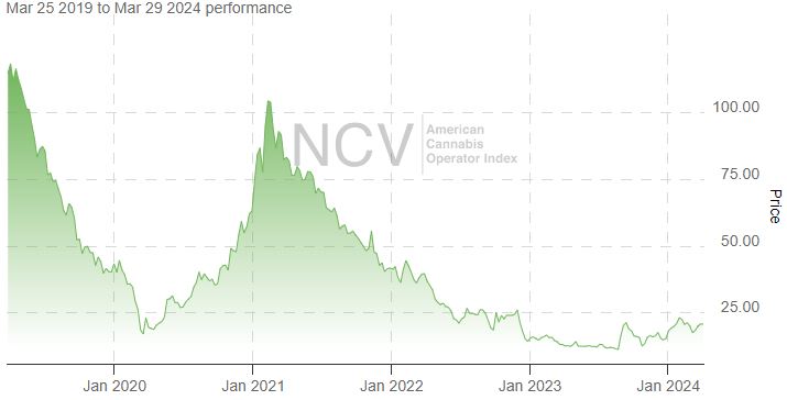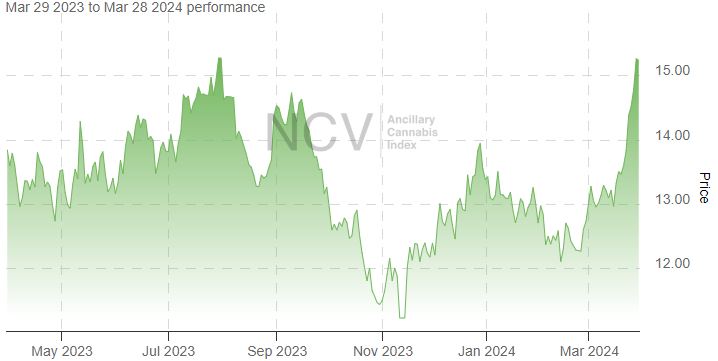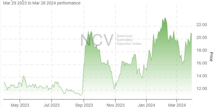 In 2023, the index rallied 7.6% to 15.34 despite the overall weakness in cannabis stocks, and a late January close was the highest close in over a year. In 2024, this index is now up 34.9%: