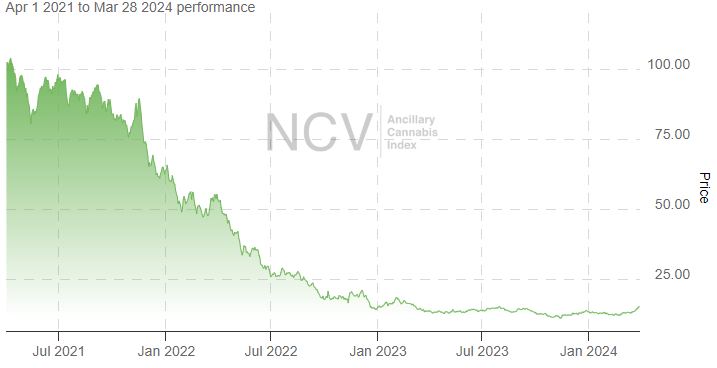 In Q4, the index lifted 0.9%. After a massive loss of 76.6% in 2022, it declined 10.9% in 2023 to 13.38, which was better than the Global Cannabis Stock Index. It is up 13.8% in 2024: