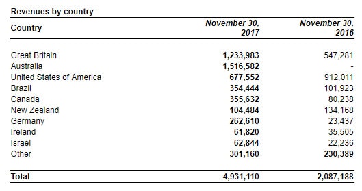 - The majority of revenues were generated by several key markets. The top five countries generated 84% of revenues for the three months ended November 30, 2017. In the previous year the top five countries generated 79% of revenues. The table below depicts gross revenues by country.