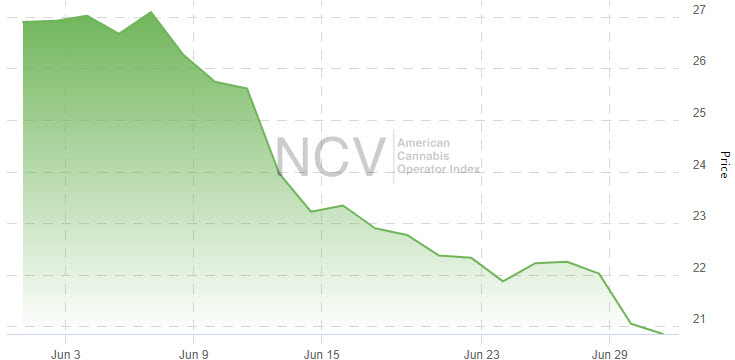The American Cannabis Operator Index fell 25.1% in June to 20.85. Its mainly MSO base is very beaten up, falling more than the broad market.
