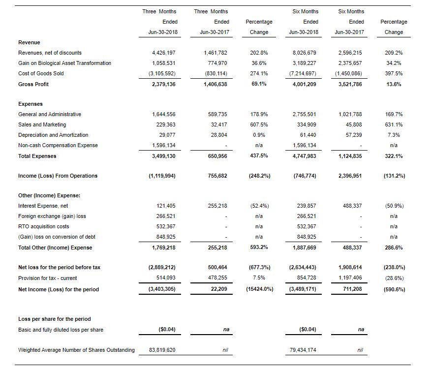 The following tables set forth consolidated statements of financial information for the three and six-month periods ending June 30, 2018 and June 30, 2017. For further information regarding the Company’s financial results for these periods, please refer to the Company’s interim financial statements for the period ended June 30, 2018 together with the MD&A, available on Planet 13’s issuer profile on SEDAR at www.sedar.com and the Company’s website https://www.planet13holdings.com.