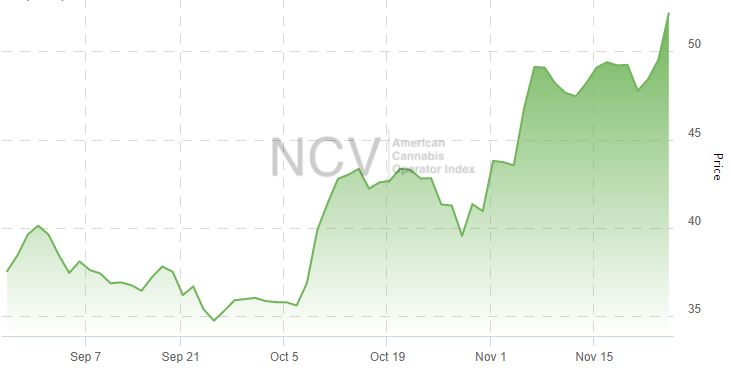 Pure US Cannabis ETF doesn’t have a specific index against which it measures its performance. The New Cannabis Ventures American Cannabis Operator Index seems like a reasonable proxy, and we note that only two of its seventeen holdings aren’t held by the ETF. Since the end of August, the American Cannabis Operator Index has increased 30%, suggesting the ETF is doing a reasonable job of capturing its opportunity thus far: