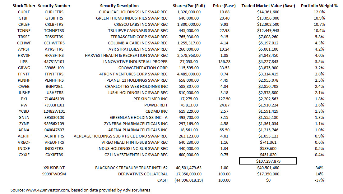 With its recent growth, the fund becomes the third largest ETF focused exclusively on the cannabis industry, trailing ETFMG Alternative Harvest ETF (NYSE ARCA: MJ) at $873 million and Horizons Marijuana Life Sciences Index ETF (TSX: HMMJ) (OTC: HMLSF) at C$448 million. Unlike its larger peers that track mainly the Canadian LPs, Pure US Cannabis ETF is focused exclusively on the American cannabis industry, with the majority of its holdings in swaps tied to multi-state operators, which comprise the top eight positions and most of the rest: