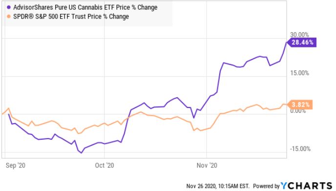 Its purchases have had an impact on the prices of some of its smaller holdings thus far, as their weighting in the fund is substantially higher in some cases relative to their market capitalizations than the largest holdings. As the ETF has gained traction, its buys have begun to impact even the largest names, as I suggested might be the case when I discussed Pure US Cannabis ETF with subscribers at 420 Investor. The September edition of the 420 Investor Newsletter, which detailed the ETF ahead of launch, also included an extensive review of Green Thumb Industries (CSE: GTII) (OTC: GTBIF) as well as a comprehensive explanation of why the elections would be a major driver of higher cannabis stock prices.