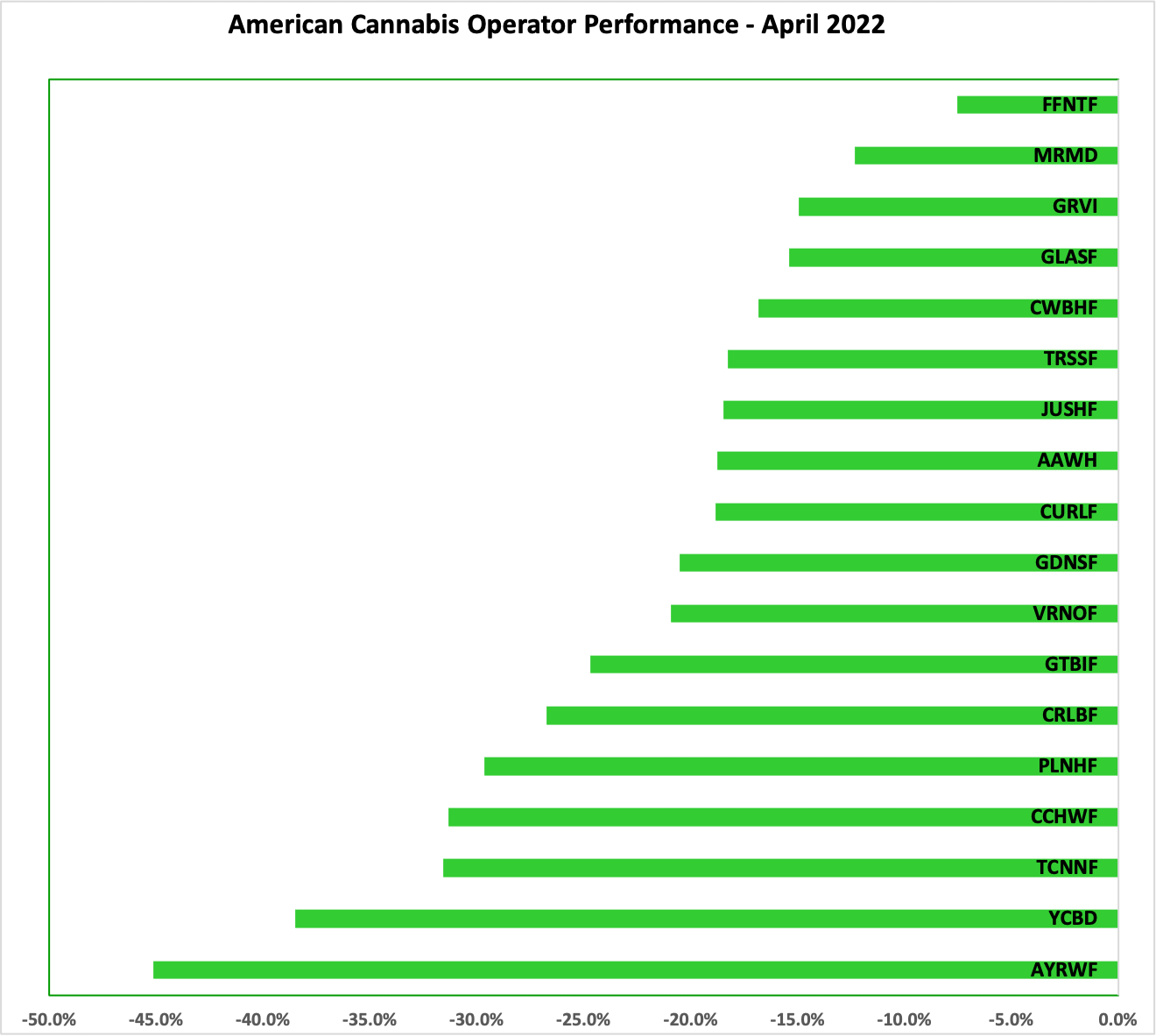During April, all companies in the American Cannabis Operator Index posted losses, including 6 that lost more than 25% of their value, with a median return of -19.6%.