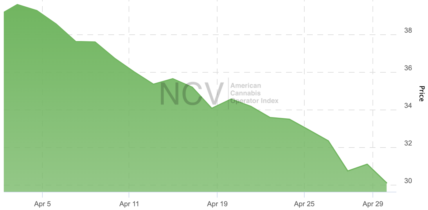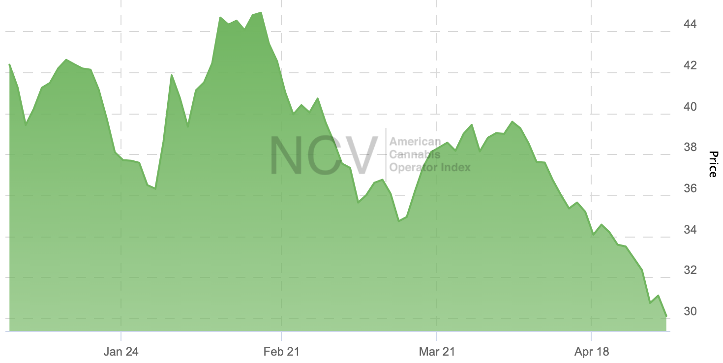 After breaking a string of eleven consecutive monthly declines in February of this year, the American Cannabis Operator Index fell 22.8% in April to 30.11.