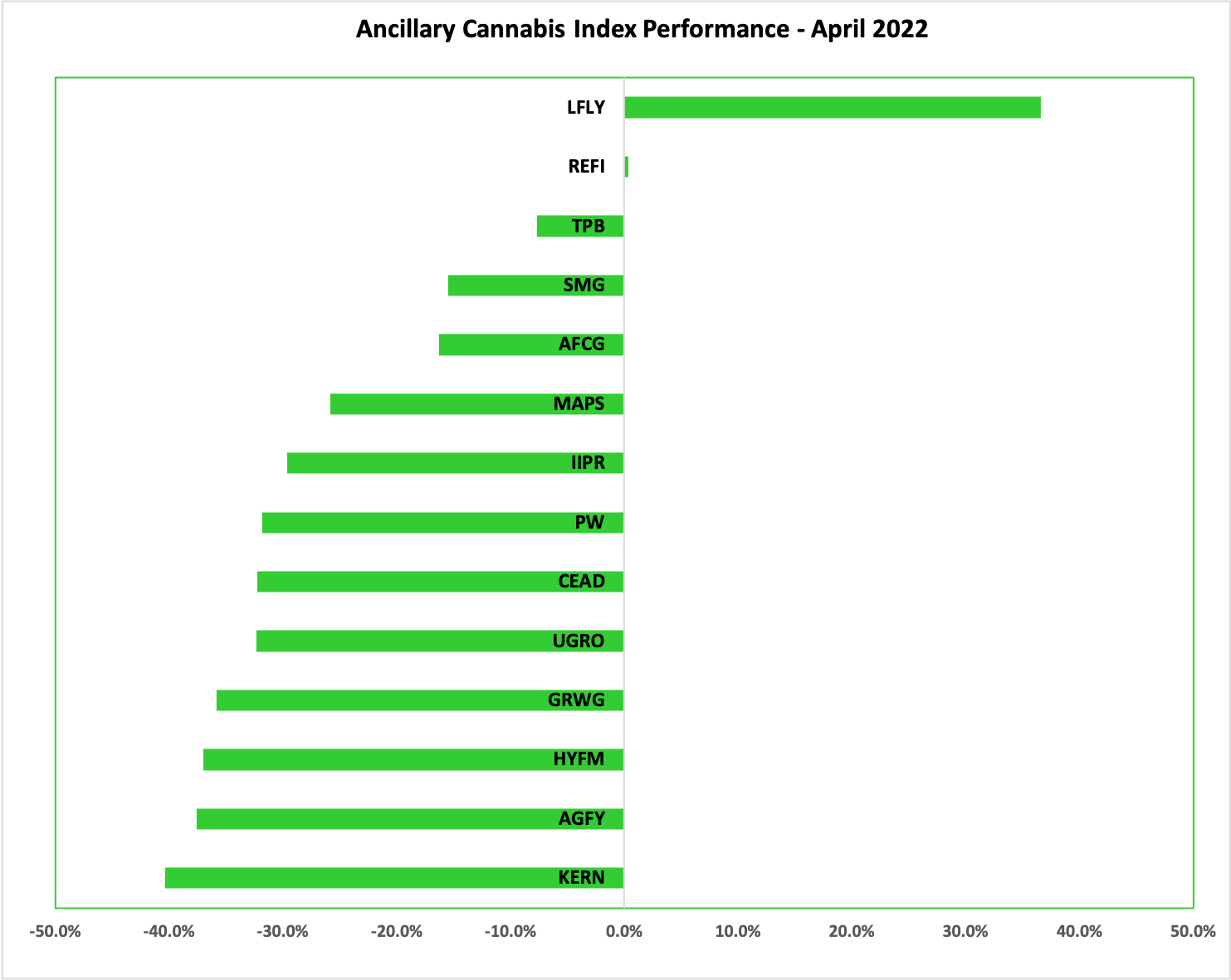 During April, the Ancillary Cannabis Index included 14 members with just one posting a gain in excess of 10% and 9 declining by more than 20%, with a median return of -30.7%.