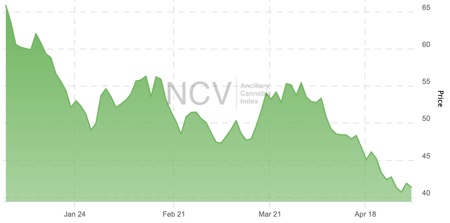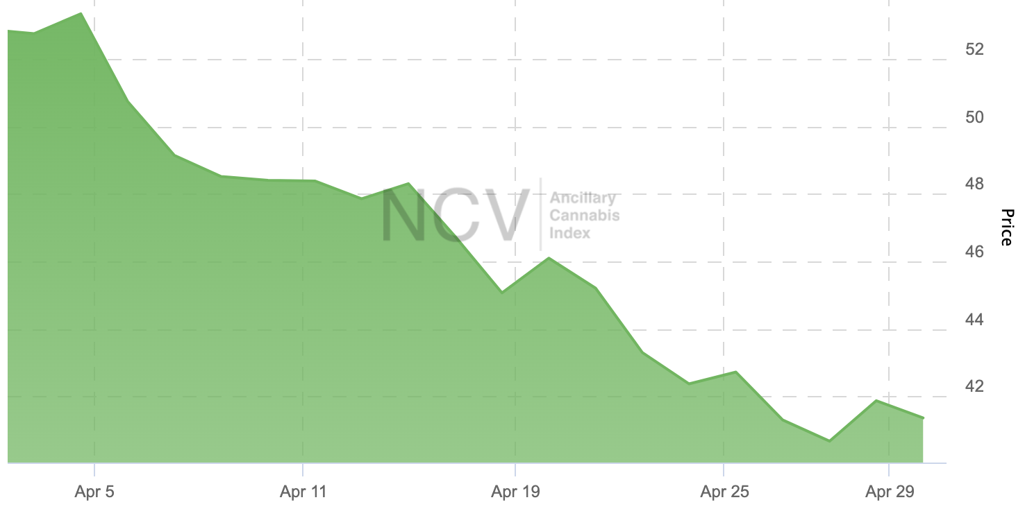 The Ancillary Cannabis Index gave back its bounce earlier in the year, declining 21.8% in April to $41.36: