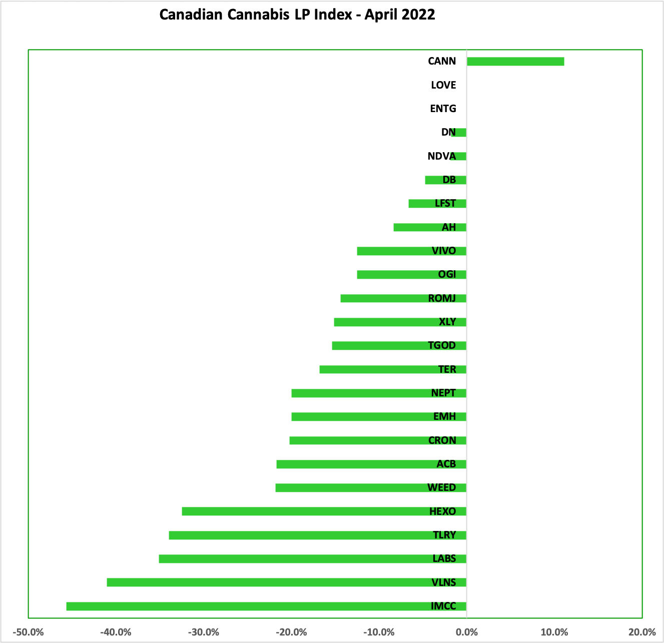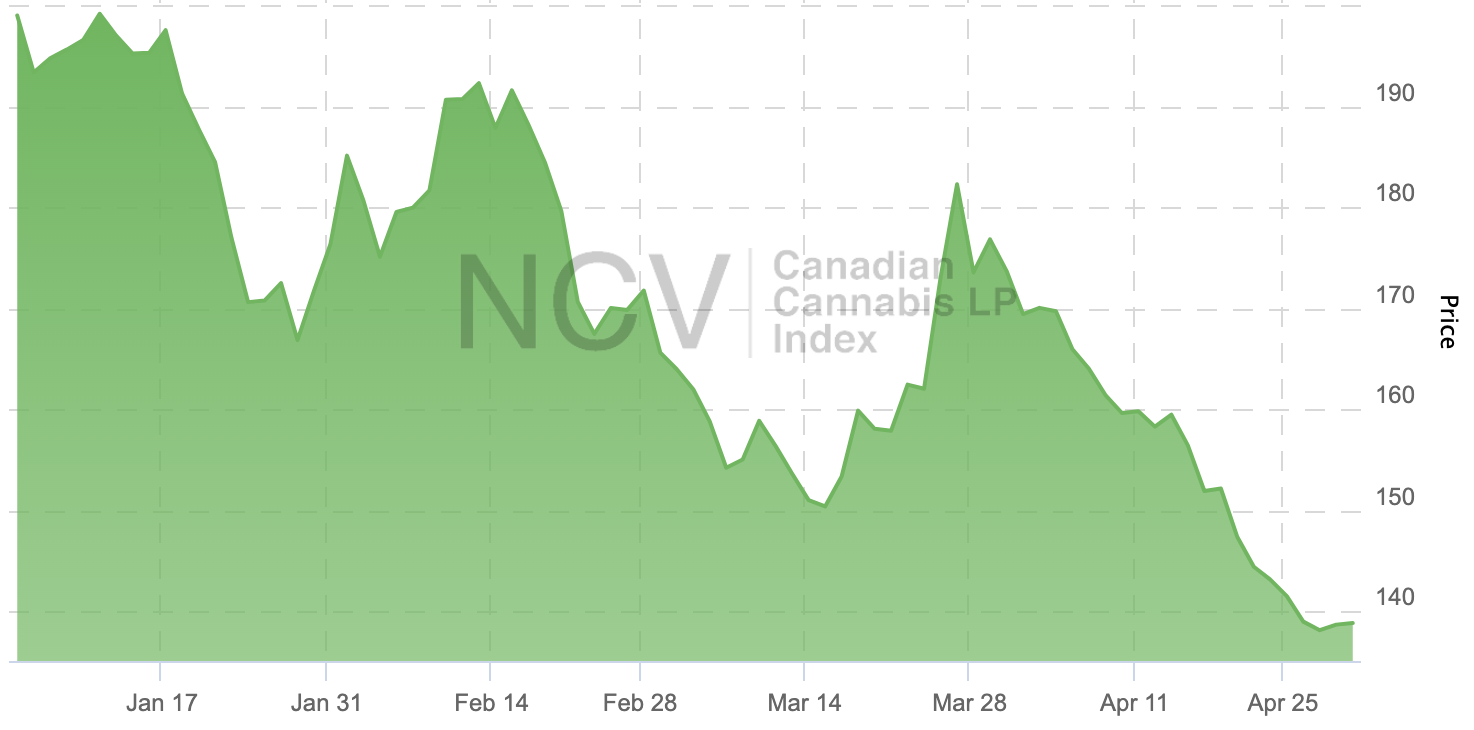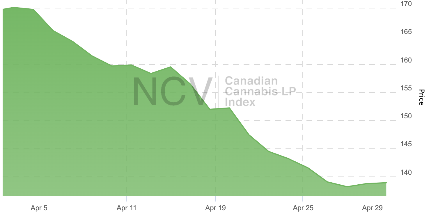 The Canadian Cannabis LP Index fell for the tenth consecutive month, declining 16.3% to 138.84 in April, with a median return of -15.3%.