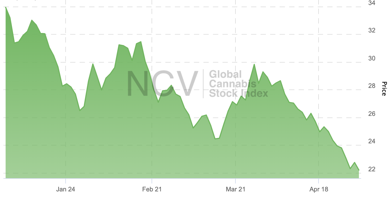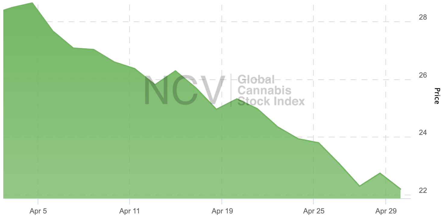 After 13 consecutive monthly declines, the Global Cannabis Stock Index lost 21.4% in April, closing at 22.20 to extend the losing streak to 14 months. The index had 35 members during the month.