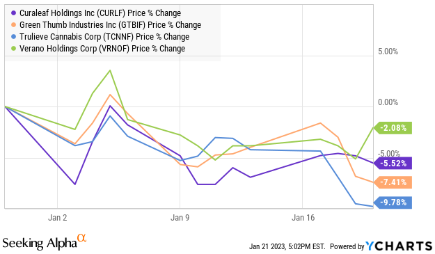 Two weeks ago, we shared our concerns with two factors, the low volume, which persists, and redemptions at the large AdvisorShares Pure US Cannabis ETF (NYSE Arca: MSOS), which has suffered additional reductions in the shares outstanding and has closed fairly regularly at a discount to its net asset value. In the past five weeks, the number of shares outstanding has dropped by 10.7% to 61.39 million. We warned readers here that the ETF is overly concentrated in the 5 largest MSOs three months ago when it had 74% of its exposure there. Now it is over 79%. The ETF has declined 28.0% since that article, and is down 2.3% so far in 2023. Cresco Labs, a 7.9% position currently, is up, but its four largest positions, which make up 71.4% of the ETF, are all down: