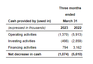 - For the first quarter of 2023, cash used in operating activities of $1.4 million, a $4.5 million decrease from the $5.9 million cash used in operating activities for the first quarter 2022. The decrease in cash used is primarily related to increased sales and gross margin for the period.