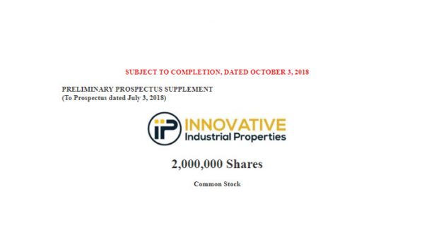 SAN DIEGO, OCTOBER 3, 2018–(BUSINESS WIRE)–Innovative Industrial Properties, Inc. (the “Company”) (NYSE: IIPR) announced today that it has commenced a public offering of 2,000,000 shares of its common stock. The Company expects to grant the underwriters a 30-day option to purchase up to an additional 300,000 shares of its common stock to cover overallotments, if any. All of the shares are being sold by the Company.