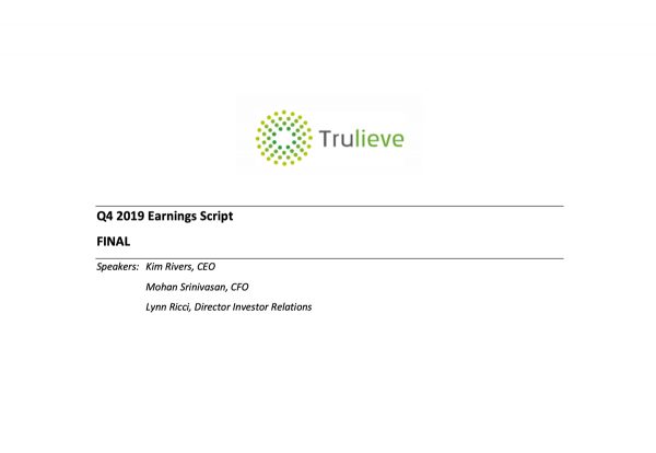 This morning we reported results for the fourth quarter and year end of 2019. A copy of our news release, financial statements and MD&A may be accessed through the Investor Relations’ section of our website, trulieve.com, and were also filed on SEDAR. In addition, a webcast of today’s conference call will be available on our website.