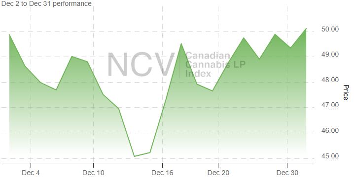 The Canadian Cannabis LP Index exploded higher in April from an all-time low set at the end of March and then plunged in May and fell further in June. In July, it posted a gain, but it fell in August and posted a new all-time low. The index moved lower in September, dropping during the month despite the overall cannabis sector advancing, but it moved modestly higher in October. In November, it set another  all-time low during the month and then again in December, but it bounced with an increase of 2.0%  during December to 50.11:
