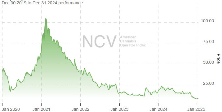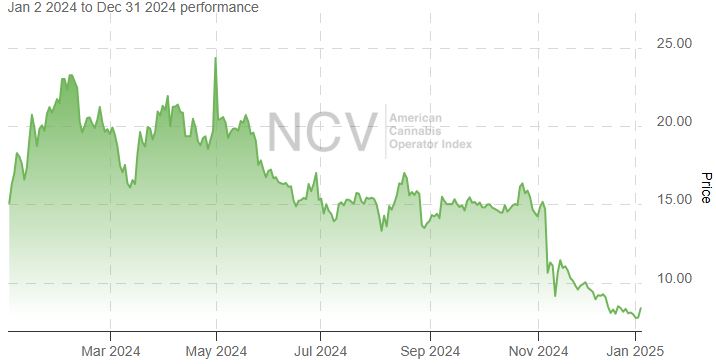 As we described in an article released earlier, the Global Cannabis Stock Index moved lower in December, falling 7.5%. It was down 15.2% in 2024.
