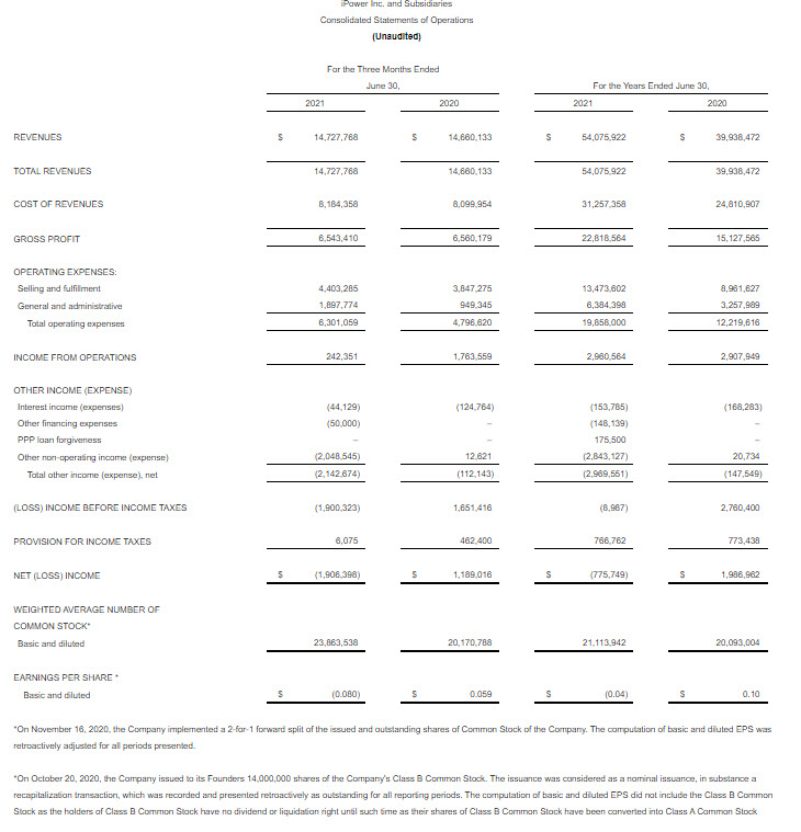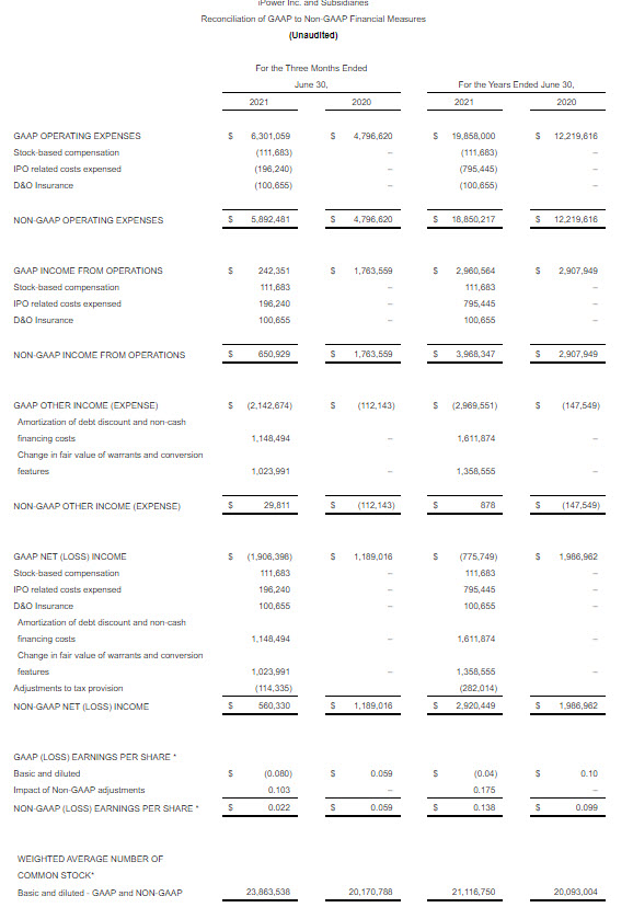 iPower has disclosed non-GAAP net income/(loss) and non-GAAP earnings per share in this press release, which are non-GAAP financial measures as defined by SEC Regulation G. The company defines non-GAAP net income/(loss) as net income/(loss) before stock-based compensation, one-time IPO related costs, D&O insurance, amortization of debt and non-cash financing costs, changes in fair value of warrants and conversion features, and adjustments to tax provisions. A table providing a reconciliation of non-GAAP net income/(loss) and non-GAAP EPS is included at the end of this press release.