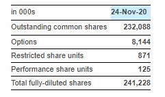 Outstanding basic and fully diluted share count as at November 24, 2020 is as follows: