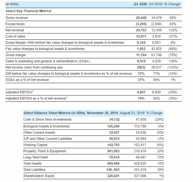 - Q1 2020 net loss of $0.9 million or $(0.006) per share on a diluted basis compared to Q1 2019 net income of $29.5 million or $0.195 per share largely due to non-cash fair value changes to biological assets and inventories sold