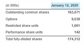 Outstanding basic and fully diluted share count as at January 12, 2020 is as follows: