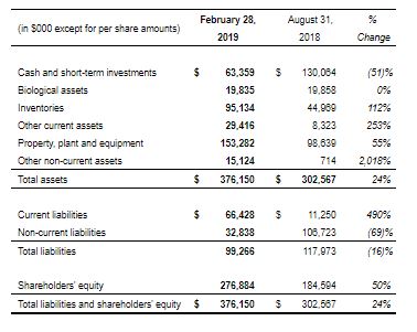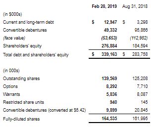 - Subsequent to quarter end, the Company’s remaining convertible debentures at a carrying value of $49.3 million(approximately $53.7 million of face value as at February 28, 2019) were either voluntarily converted by holders or force converted at a conversion price of $5.42 by the Company as at April 1, 2019 resulting in an issuance of approximately 9.9 million common shares of the Company. The conversion of the debentures has removed the $49.3 million liability from the balance sheet and eliminated a 6% cash coupon payment to the previous maturity of January 31, 2020.