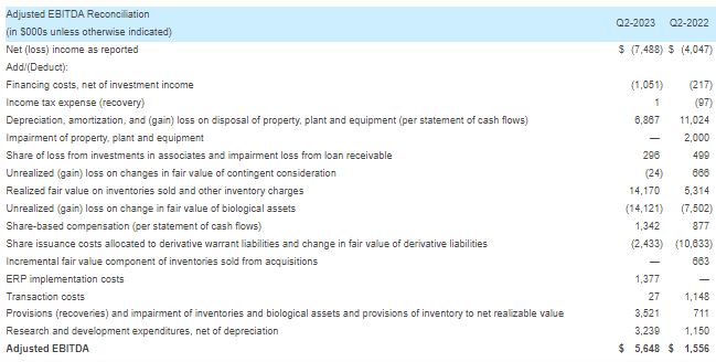 The most directly comparable measure to Adjusted EBITDA, calculated in accordance with IFRS is net income (loss) and beginning on page 4 of this press release is a reconciliation to such measure. The most directly comparable measure to adjusted gross margin calculated in accordance with IFRS is gross margin before fair value changes to biological assets and inventories sold and beginning on page 5 of this press release is a reconciliation to such measure.