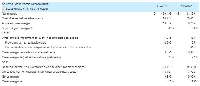The following table reconciles the Company’s adjusted gross margin to gross margin before fair value changes to biological assets and inventories sold: