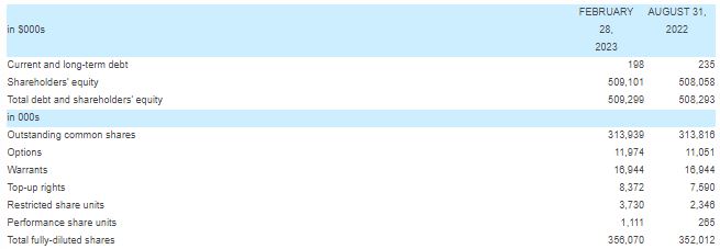 - On February 28, 2023, the Company had unrestricted cash and short-term investments balance of $72.0 million compared to $98.6 million at August 31, 2022. The decrease is primarily a result of capital expenditures of $13.9 million, along with a $14.5 million reduction to payables.