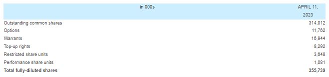 Outstanding basic and fully diluted share count as at April 11, 2023 is as follows: