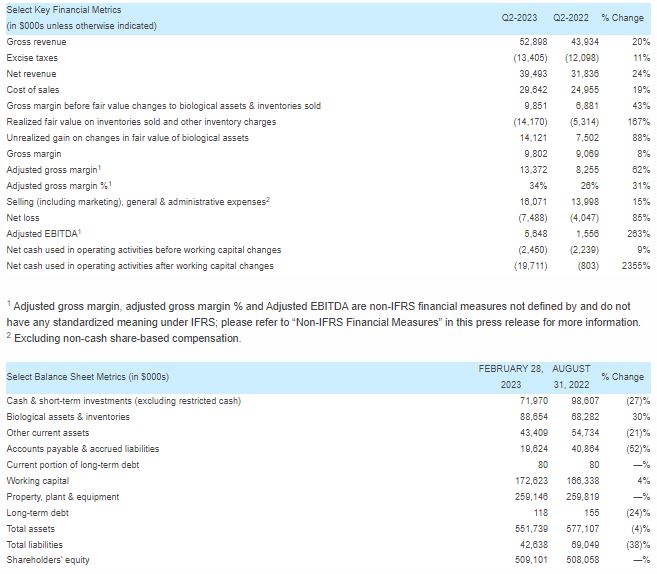 - Q2 Fiscal 2023 Adjusted EBITDA was $5.6 million compared to $1.6 million in Q2 Fiscal 2022. The improvement is primarily attributable to the increase in adjusted gross margins due to the higher volume of products sold, increased international sales, and lower cultivation and post-harvest costs.