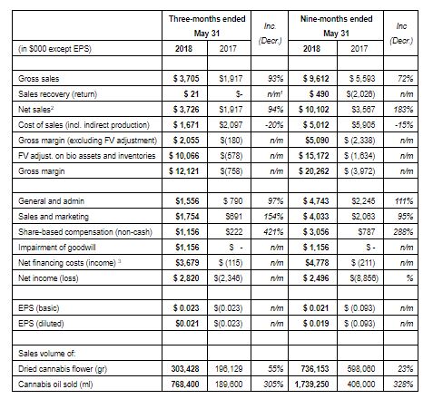 • Record sale volume of cannabis oil for the three-months ended May 31, 2018 (768,400 milliliters) up 39% from Q2/18 (552,250) and up 452% from Q3/17 (139,200 milliliters);